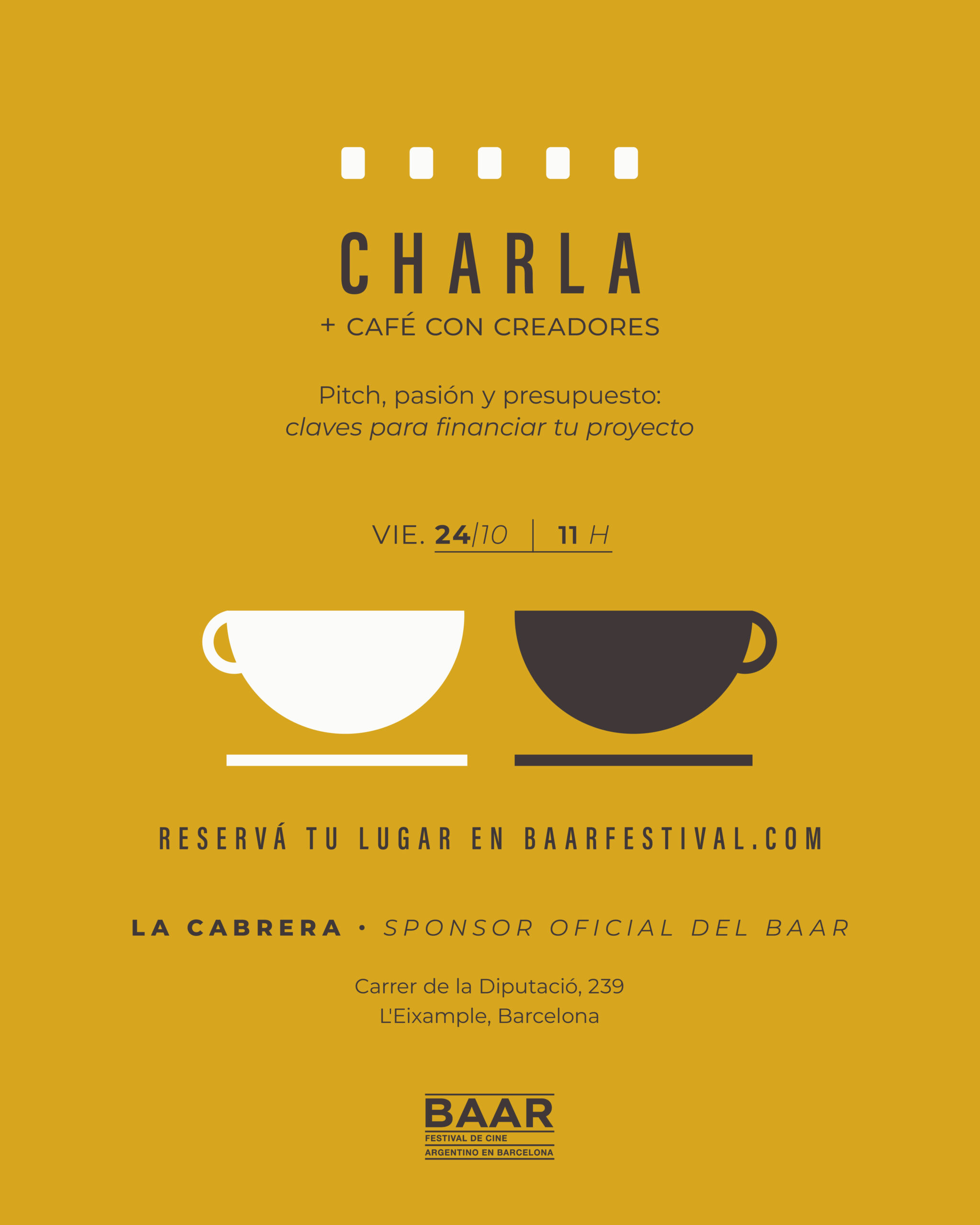 Un encuentro para creadores que quieran conocer oportunidades reales de financiación para sus proyectos culturales, no solo de cine. En formato distendido con profesionales distinguidos —tomando un café— compartiremos herramientas, estrategias y experiencias para hacer realidad tus ideas. Será en La Cabrera, Barcelona sponsor oficial de BAAR. Carrer de la Diputaciò, 239 L’Eixample.